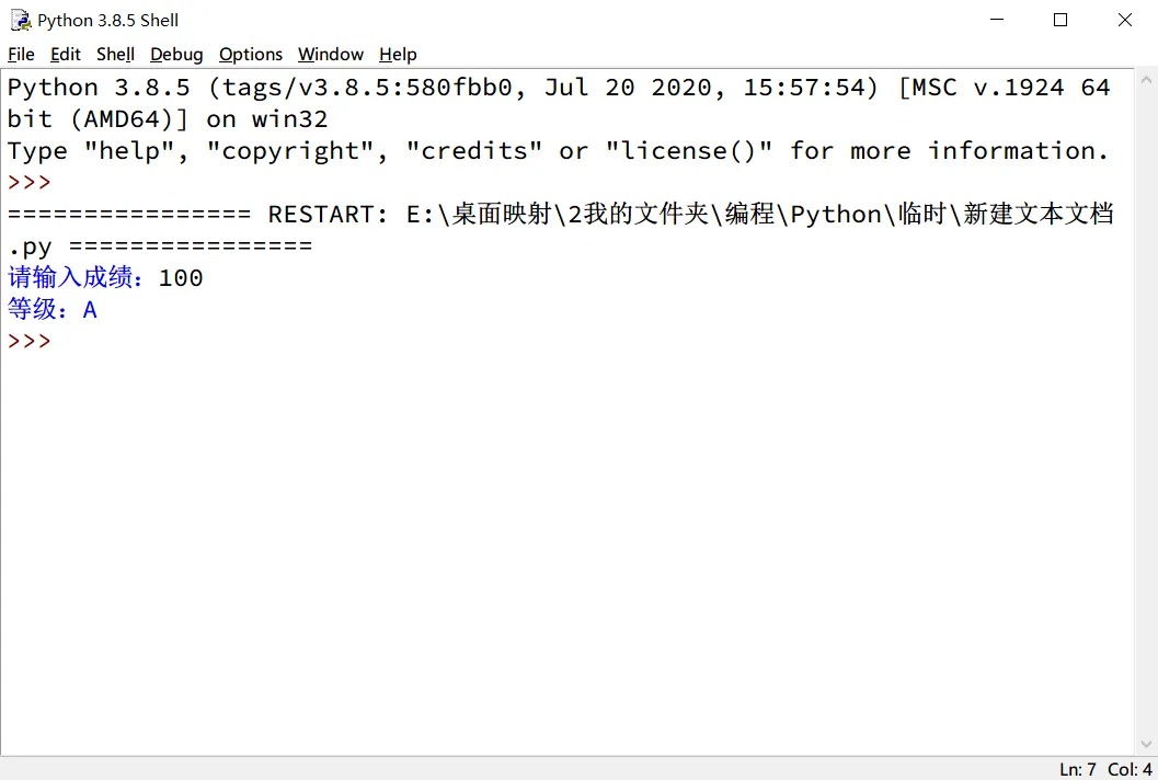 同学输入成绩(不大于100的正整数),根据下表提示输出该考生等级。