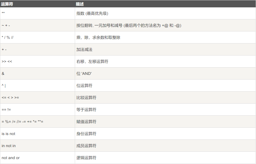 下表中列出的是Python中所有运算符的优先级关系。部分内容我们赞数没有说到,大家参考已经掌握的即可。