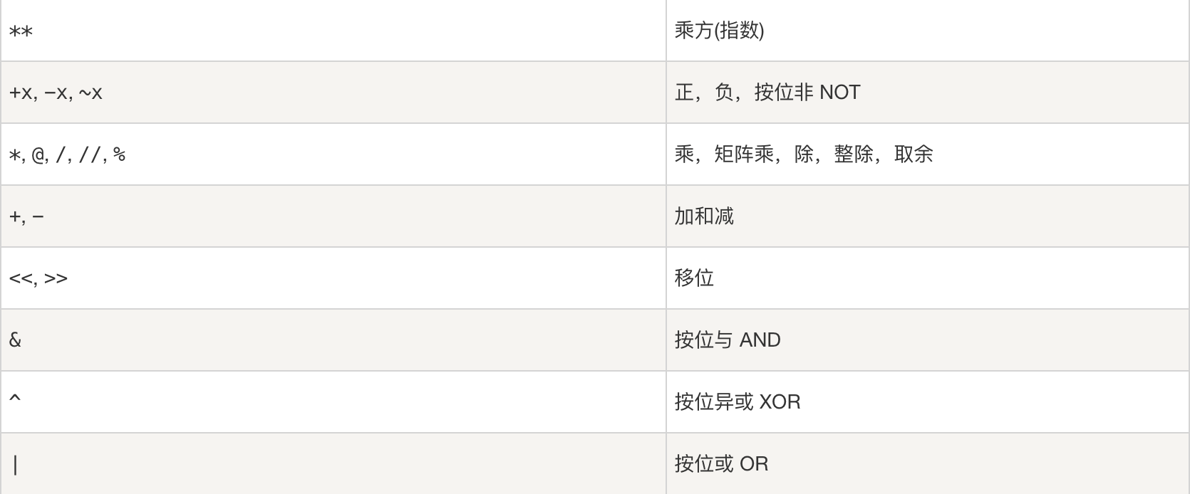 下表中列出的是 Python 中与数值运算有关的运算符的优先级关系。更完整的优先级列表将在逻辑运算中提及。