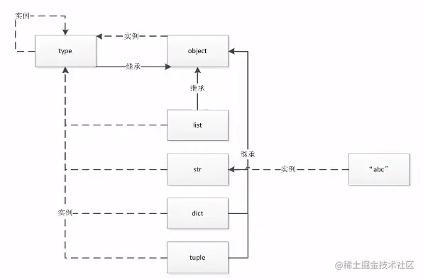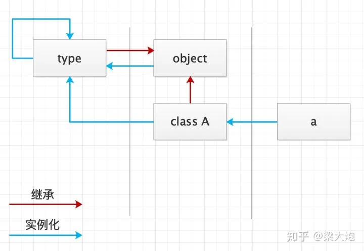 type --实例化--> object --衍生(继承)--> class A (类) --实例化--> a(具体对象)